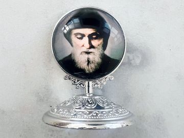 Saint Charbel set on a beautiful metal ornate silver stand with base (double sided tape has also been applied to the base of the stand which enables guests to simply peel to stick should they chose to) is the ideal choice for a bomboniere!