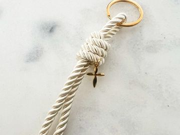 Precious white cross keyring complete with gold plated trimmings & rope.